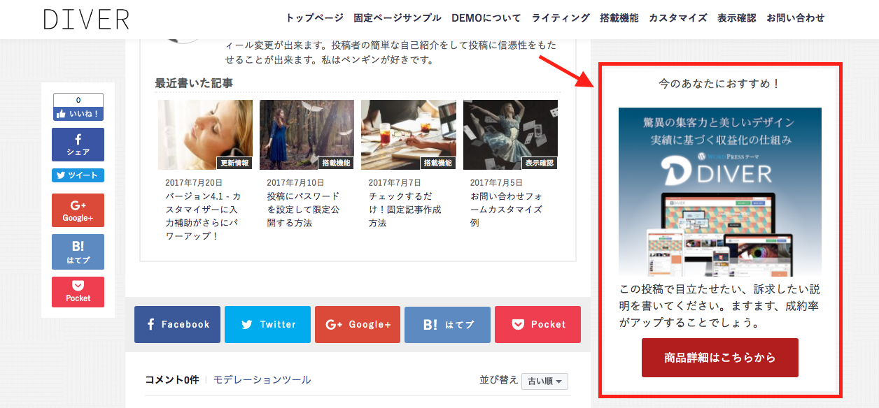 投稿ごとにもっともアピールしたい商材やアクションをサイドバーに追従表示させることが可能です。CTAは、記事を最後まで辿り着かなければアクションポイントに達しないのが特徴ですが、アピールブロックを利用すると、すぐにそのページのアクションが明確化される他、CTAは商品購入で、アピールブロックでは、メルマガ登録など色々使い道が考えられます。