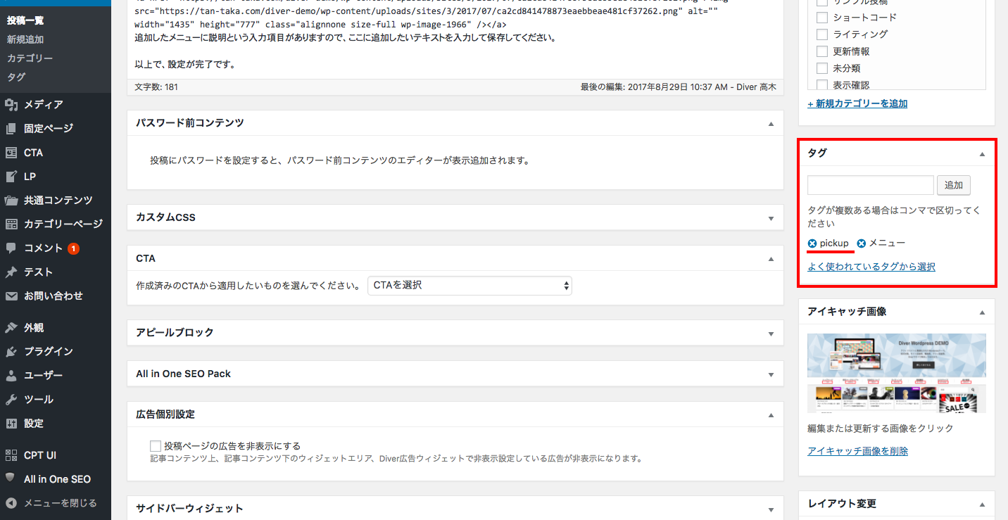 同じ要領で、複数の記事にも同じタグを設定してスライダーの記事を増やしてください。 以上で、ピックアップスライダーの作成ができます。