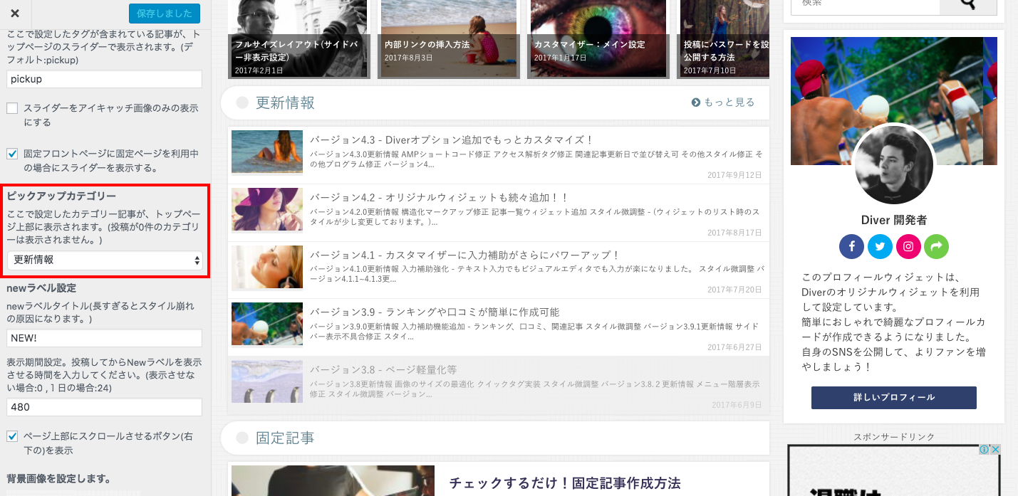 カスタマイズ > メイン設定 > ピックアップカテゴリー で表示したいカテゴリーを選択するだけです。 プレビューで表示されたのがわかると思います。