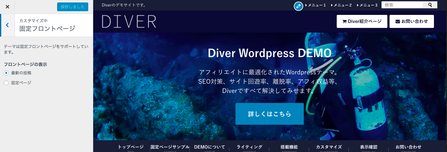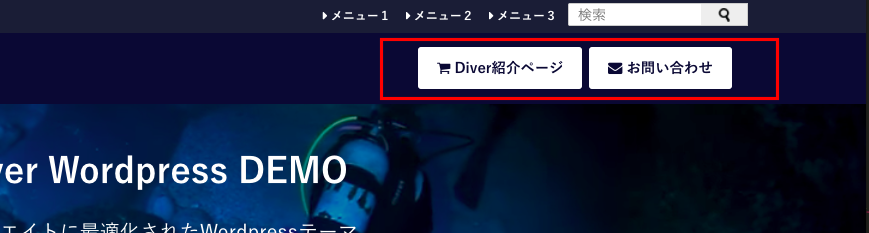 DiverDEMOサイトでは、独立メニューに設定しているので、上記画像のような表示になりますが、ロゴと並立にした場合には、ロゴの横にメニューが表示されます。