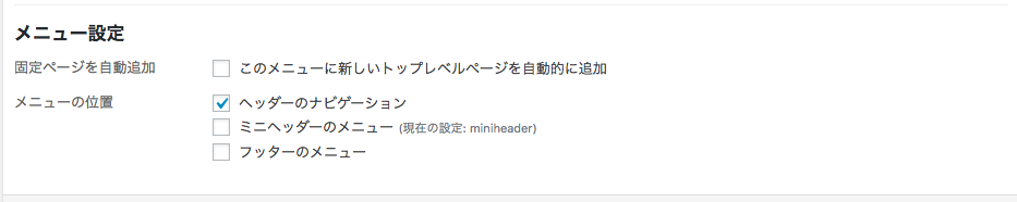 作成したメニューのメニューの位置をヘッダーのナビゲーションにチェックをいれます。