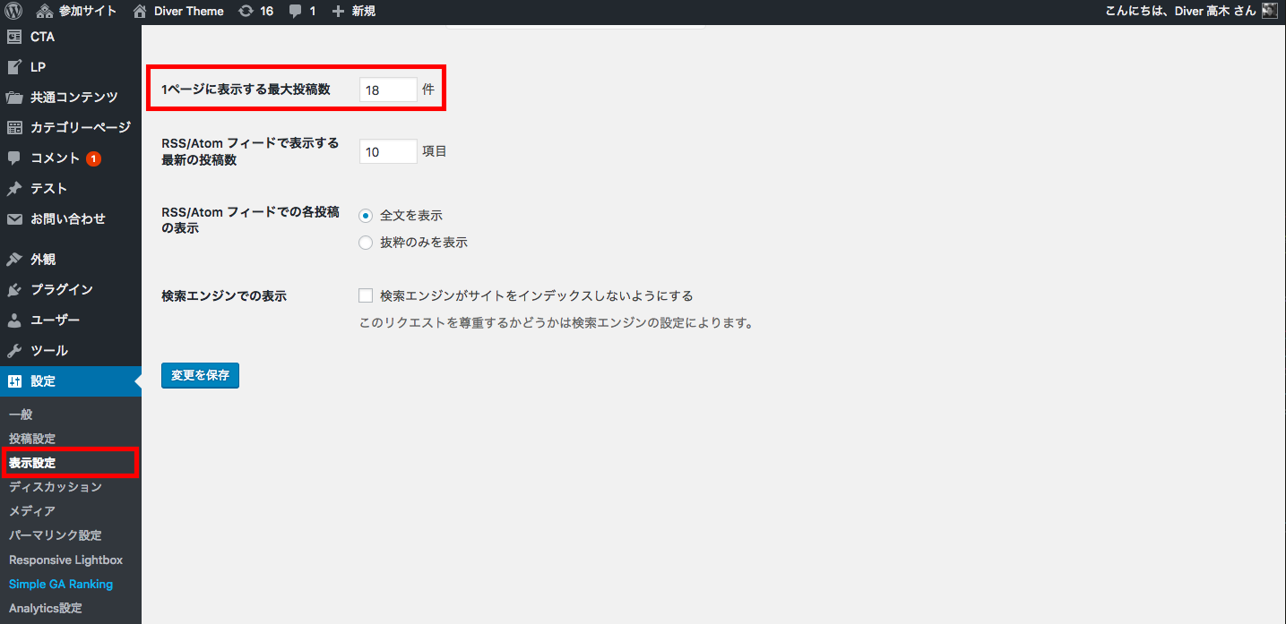 管理画面 > 設定 > 表示設定 > 1ページに表示する最大投稿数 から変更が可能です。