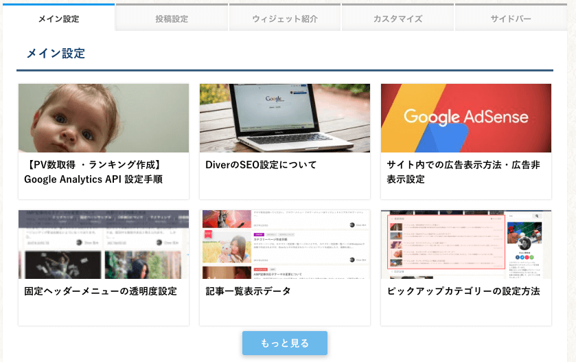 <div class="button shadow block blue"><a class="midium" href="https://tan-taka.com/diver-demo/category/manual/mainseting">もっと見る</a></div>ピックアッピカテゴリー