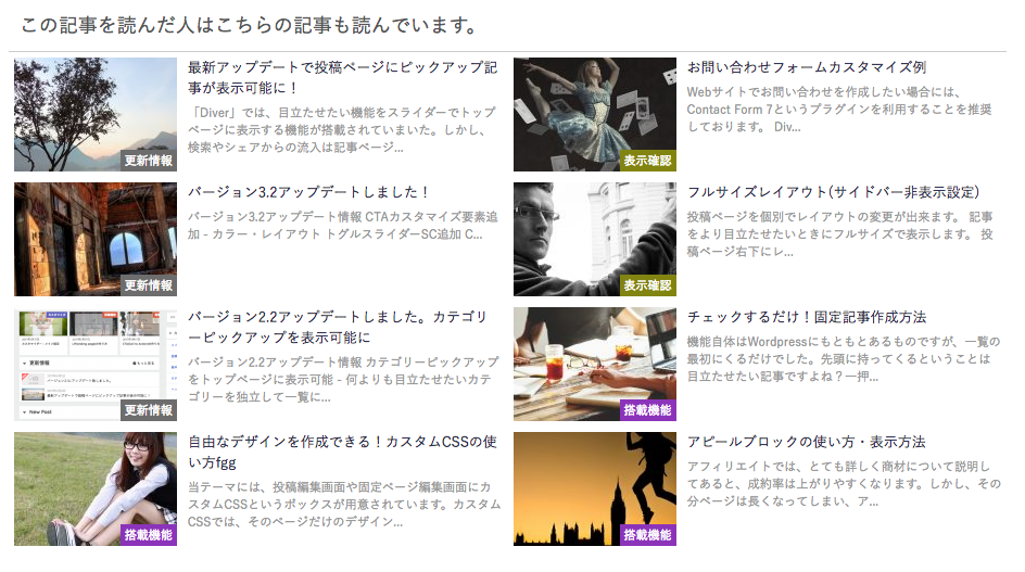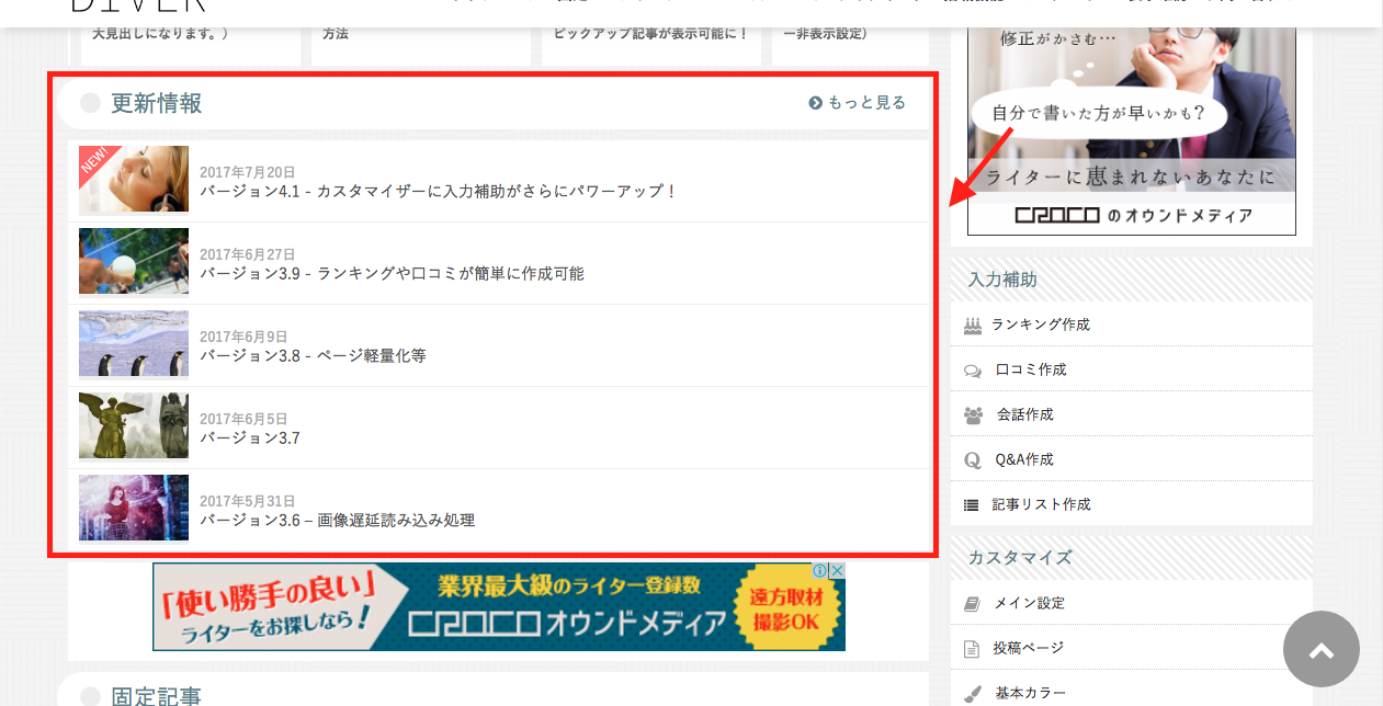 特集を組んで、カテゴリーピックアップしたり、サイト運営者からのお知らせ等を表示させたりすることが可能です。Wordpressでは、投稿一覧を一種類しか表示できないのですが、Diverでは、2つ表示することが可能になります。